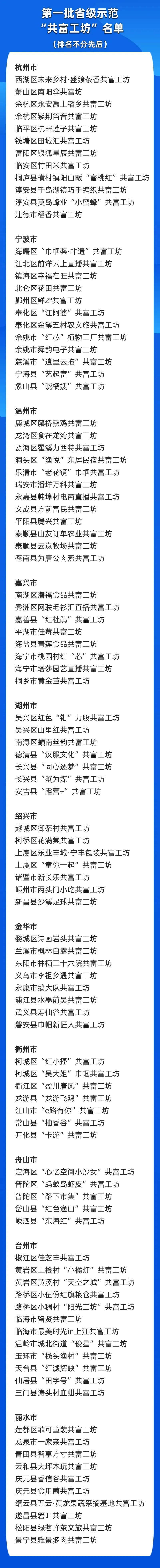 为深化推进党建引领“共富工坊”建设,更好发挥示范工坊带动作用,近期,省委组织部、省委两新工委公布第一批省级示范“共富工坊”名单,杭州市西湖区未来乡村·盛飨茶香共富工坊等100家上榜。