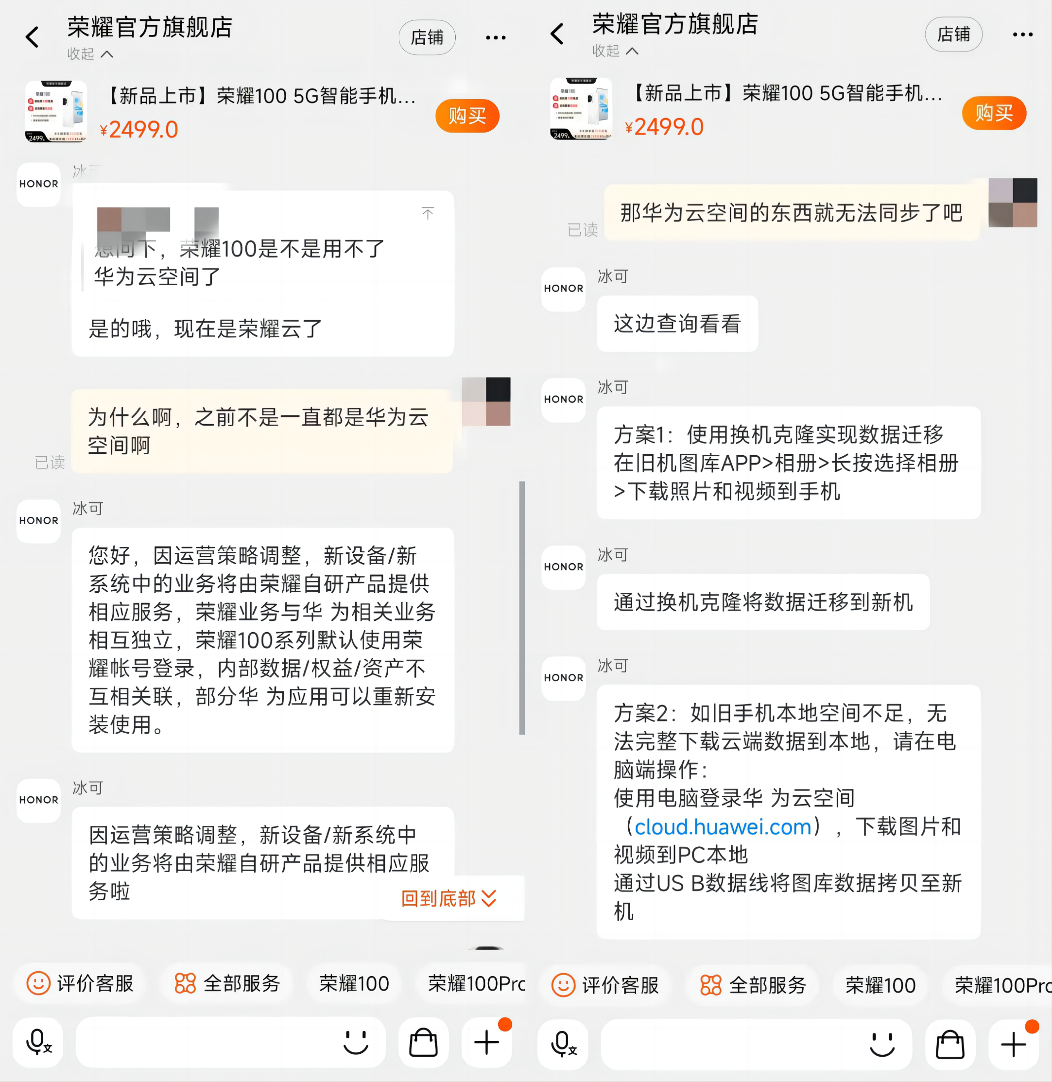同时,记者以消费者的身份咨询荣耀天猫官方旗舰店客服,客服表示,“因运营策略调整,新设备/新系统中的业务将由荣耀自研产品提供相应服务,荣耀业务与华为相关业务相互独立,荣耀100系列默认使用荣耀账号登录,内部数据、权益、资产不互相关联”。而对于使用云空间过程中遇到的问题,客服也提供了两种解决方案,比如可以使用换机克隆实现数据迁移,也可以在电脑端先将图片和视频下载下来再通过USB数据线导入新机。