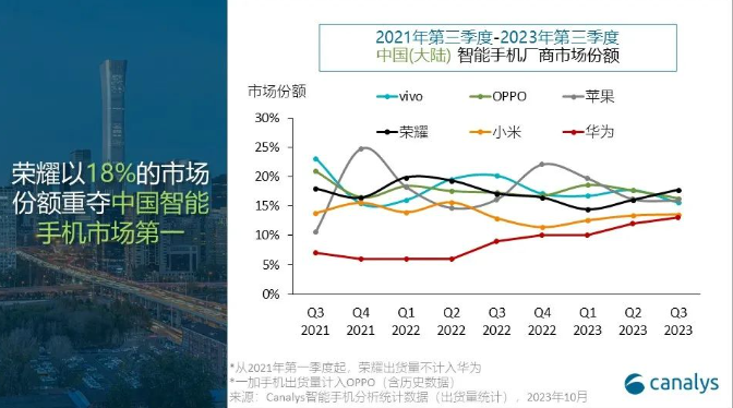 到了2023年第三季度,荣耀以18%的市场份额再次登顶中国智能手机市场榜首,领先第二名OPPO 2%的市场份额。值得注意的是,此时的华为也在暗自发力,市场份额逐渐攀升,紧逼第五的小米。