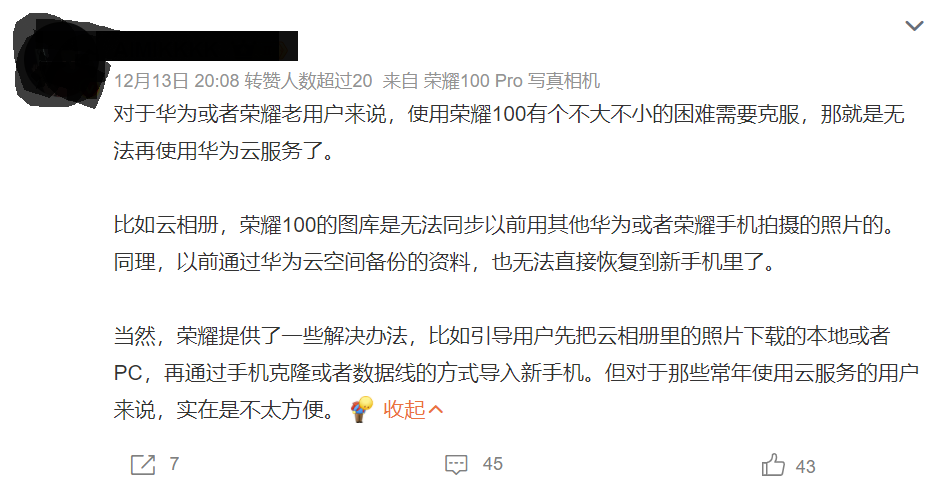 另一方面,与华为的崛起截然不同的是,脱胎于华为的荣耀却无法再度回归华为,享有华为的一切支持。从告别鸿蒙OS拥抱安卓系统到华为云空间不再支持荣耀100等新荣耀设备上安装及使用,荣耀已然被华为彻底“嫌弃”。