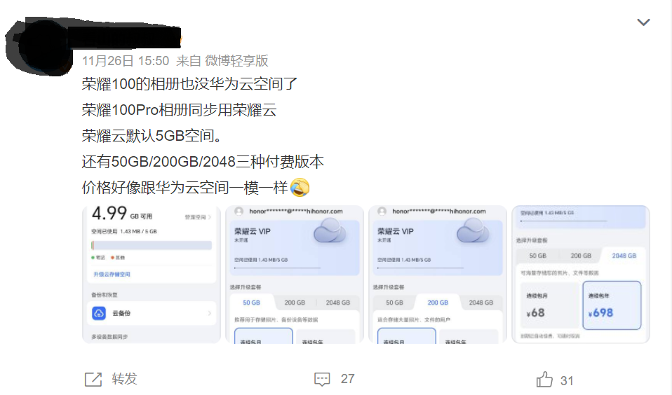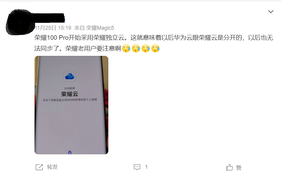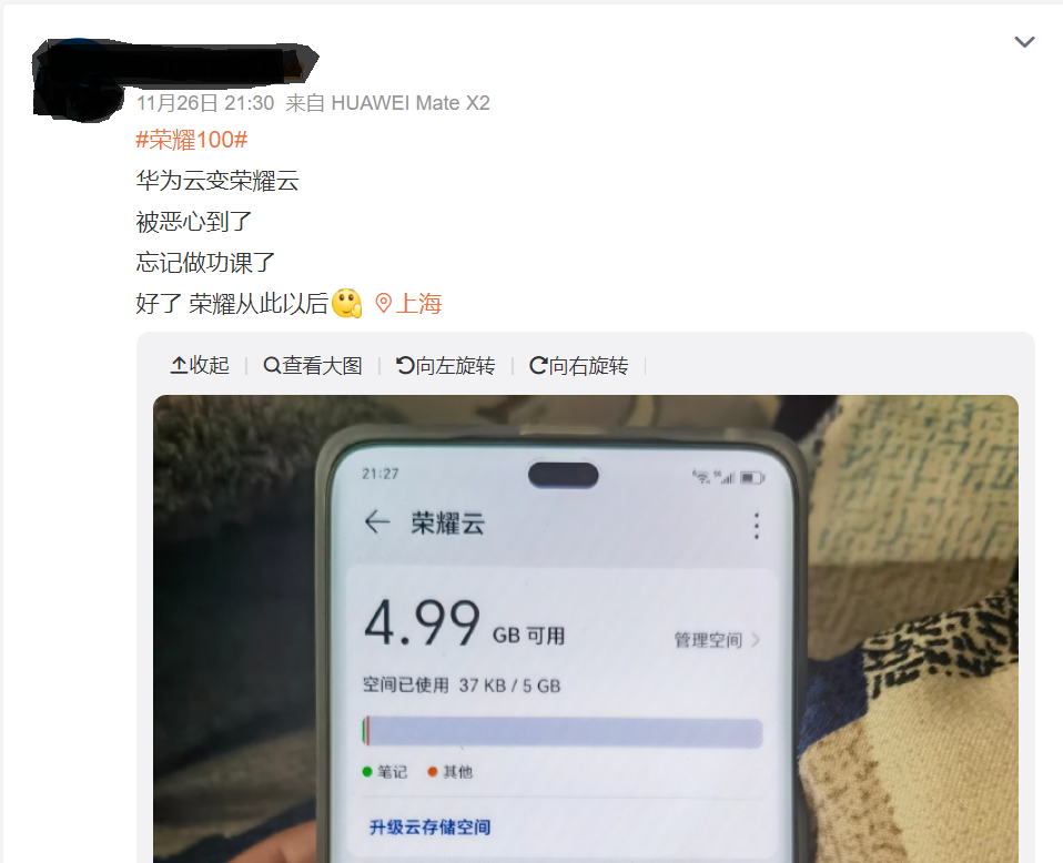 近日,有多名网友纷纷表示,新买的荣耀100手机已经无法使用华为云空间了,统一变成荣耀自己的云空间,无法使用华为账号登陆,无法与华为云空间快速同步,数据、钱包、卡片等信息都不再互通,给他们带来了不小的麻烦。