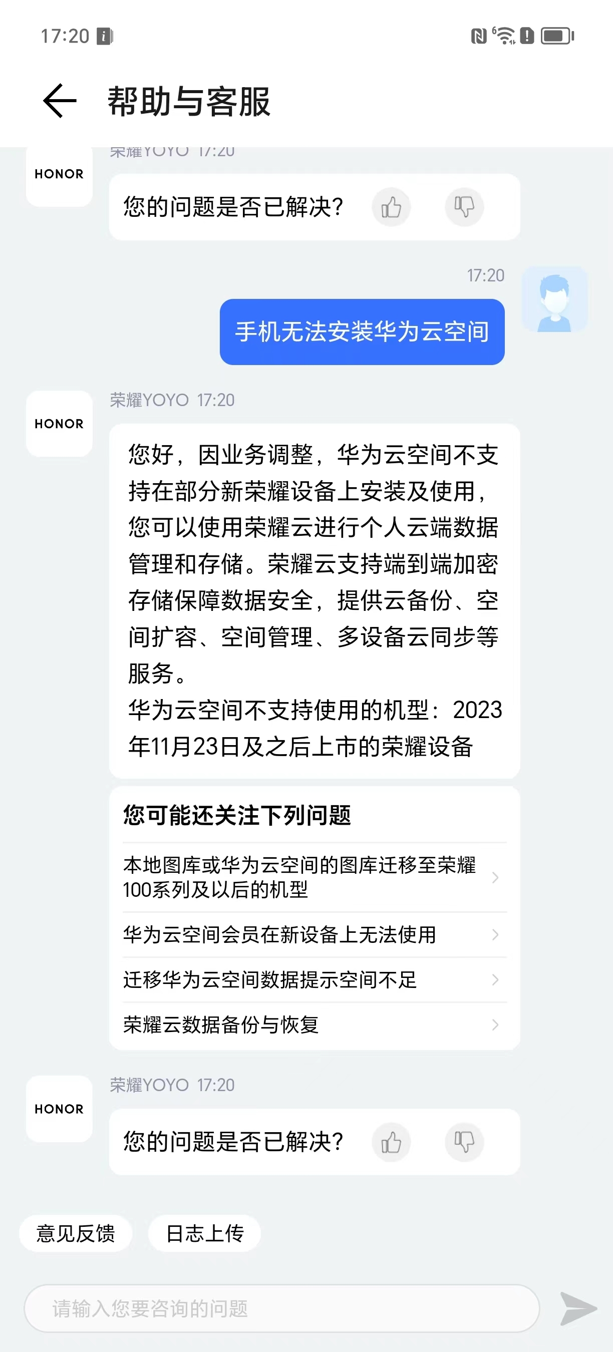 对此,有消费者联系荣耀客服,得到的答复为,“因业务调整,华为云空间不支持在部分新荣耀设备上安装及使用”,“不支持使用的机型为2023年11月23日及之后上市的荣耀设备”。