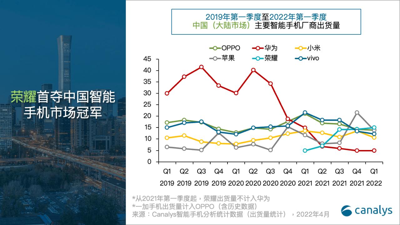 据市场调研机构Canalys数据显示,2022年第一季度,荣耀以20%的市场份额登顶中国智能手机市场,而华为则早已掉出市场前五的争夺。