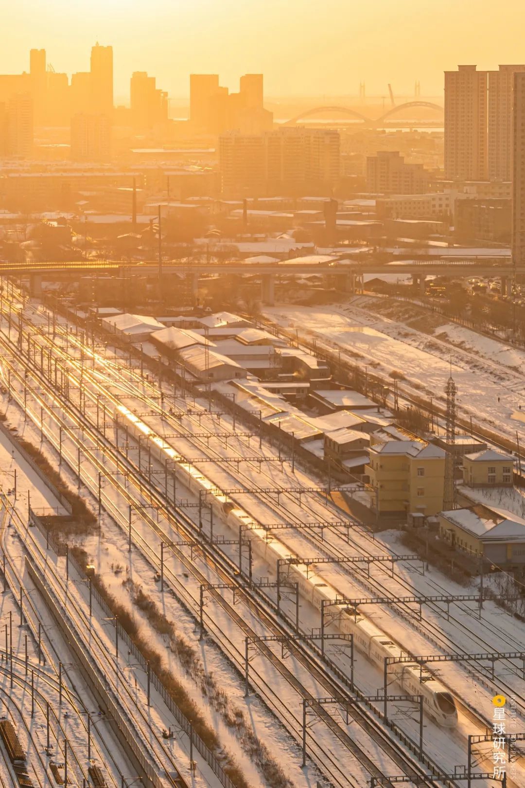 (哈尔滨至佳木斯客运专线动车组列车雪后逐日,摄影师@哈局巡道工)