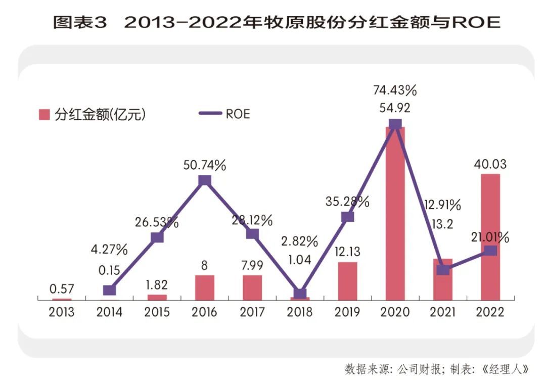 2014-2022年期间,牧原股份通过增发A股、发行优先股、发行可转债方式一共从资本市场融资276.65亿元,因此,也需要重点关注公司投资回报率表现。如图表3所示,公司ROE回报率呈现周期性变化,主要是因为终端市场猪肉价格周期性变化所致,如在2020年,受非洲猪瘟影响,终端猪肉价格疯狂上涨,得益于专业、科学防控举措,公司生猪出栏量大幅增加,随之而来的是净利润与ROE的双双攀升,2020年分红金额更是高达54.92亿元,是2013-2019年期间总计分红的1.73倍。自2014年上市以来,牧原股份平均ROE为28.45%,介于高回报率水平区间,累计实现分红139.85亿元,表现良好。