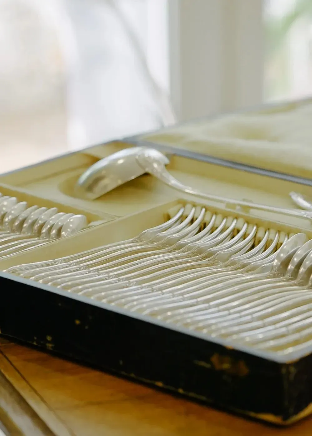 爷爷奶奶还留下了许多银质的餐具,茶壶、刀叉、勺子。有专门吃牡蛎、吃餐前甜品的、吃不同肉类的。这些餐具时间久了会氧化发黑,擦洗起来很麻烦,但我们觉得很值得。