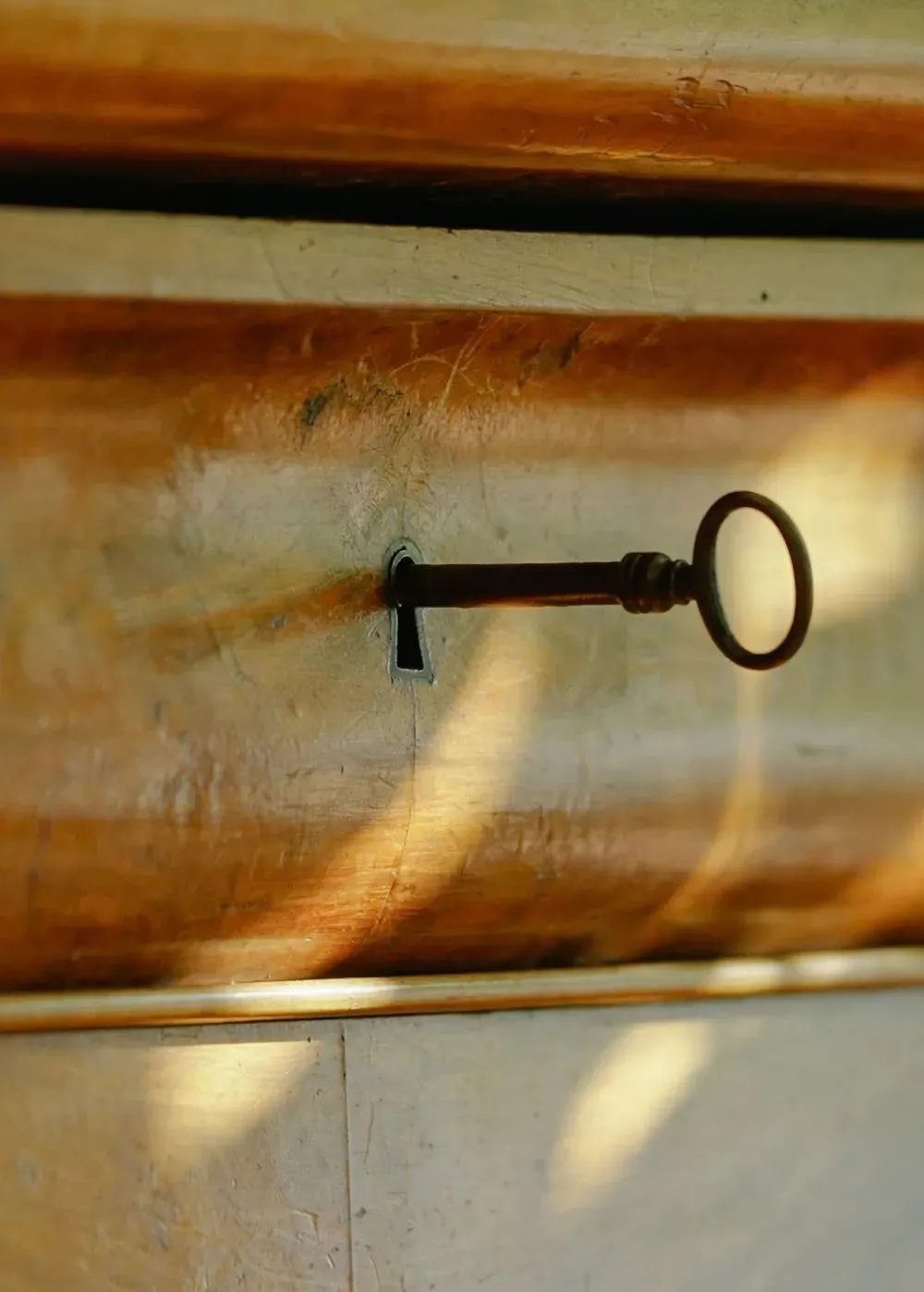 古董家具的有趣细节。柜子上的铜质钥匙(上)和地毯上的纹理(下)