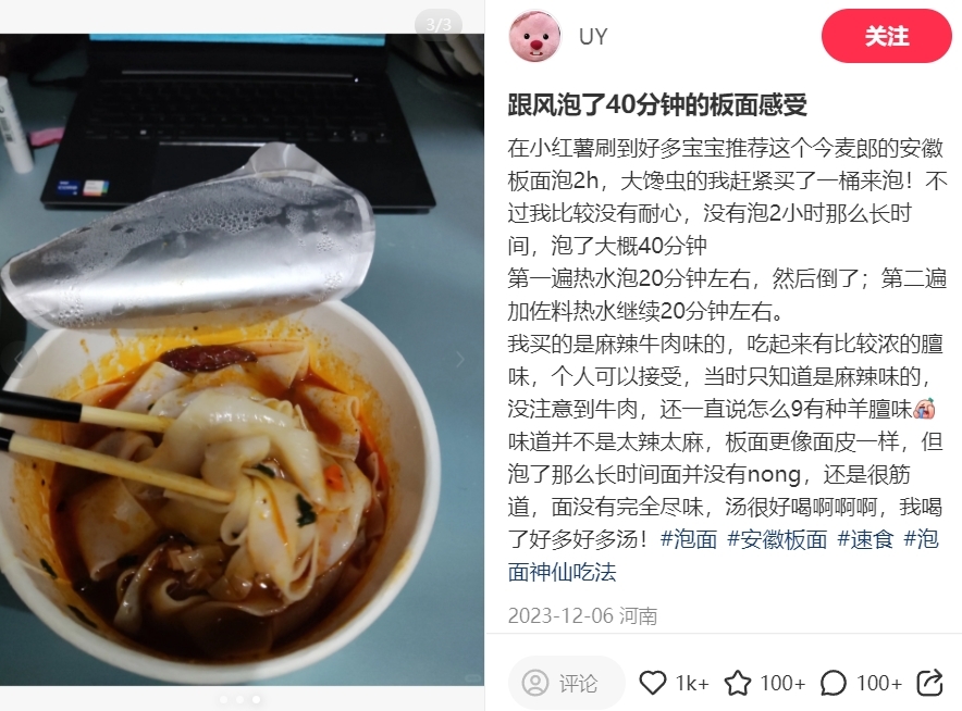 今麦郎安徽板面产品有多火呢?从小红书上,“今麦郎板面竟然要这样泡”“跟风泡了40分钟的板面感受”“学小红书泡了两个小时的板面”等频频成为博主笔记标题中就可以略知一二。