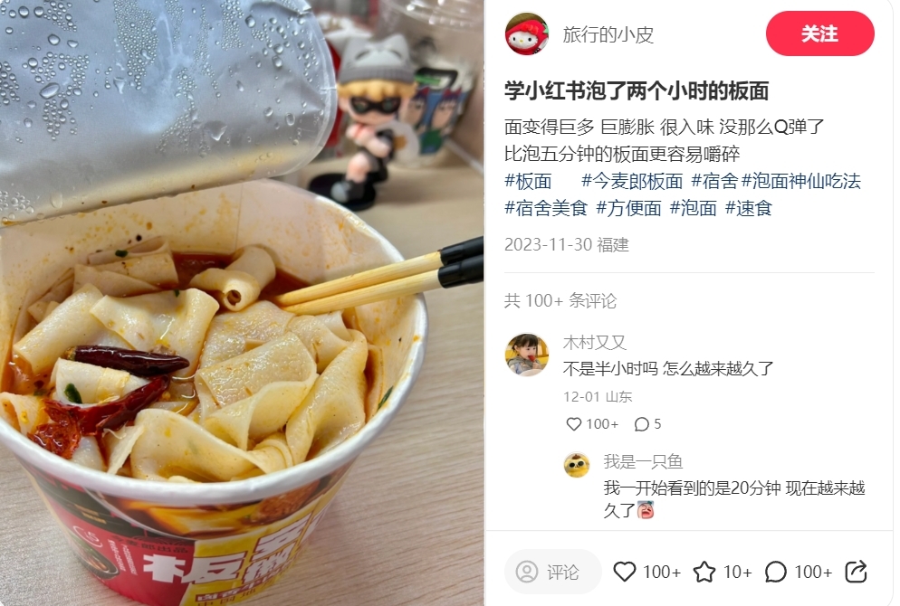 但毕竟是经历过新消费浪潮洗礼的年轻消费者,惊讶的时间,往往和对品牌的忠诚度成正比,短暂惊讶后,讨论的焦点,逐渐从“为什么这么久”,走向了“这款板面,到底是泡20分钟好吃,还是泡30分钟好吃”,网友们还分享起了各自的心得。