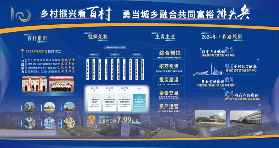 2013年至今,奉贤区先后成立上海百村实业有限公司、上海百村科技股份有限公司、上海百村富民经济发展有限公司、上海百村谊民经济发展有限公司等4个“百村”品牌系列企业,截止目前,百村公司已拥有31.4亿元资产、年均分红超1亿元、累计分红8亿元。通过四家“百村公司”的运作,到2017年底,奉贤100个经济薄弱村全部脱贫。