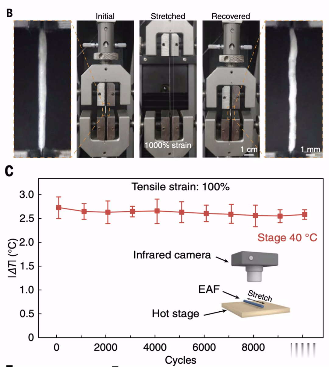 并且这种拉伸不会造成保温性能的损失,研究人员对EAF材料反复拉伸到10倍长度,重复一万次后温度并未发生明显变化。