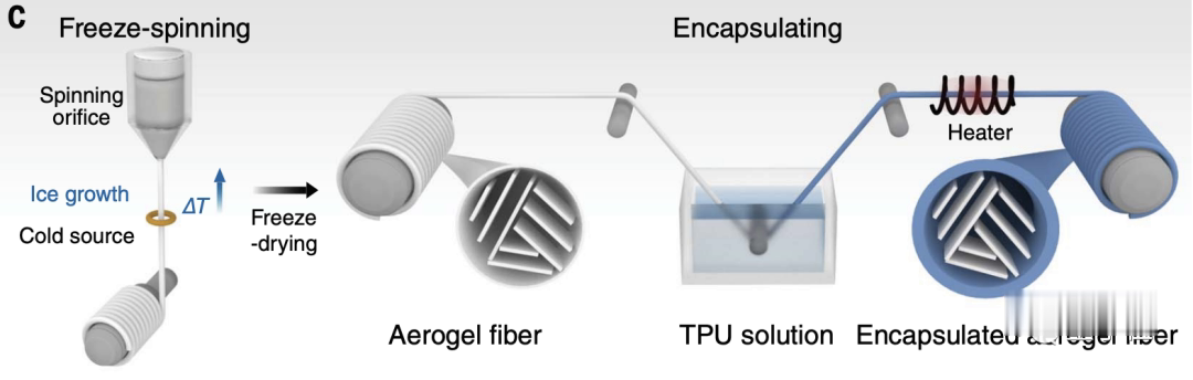 然后将壳聚糖溶液通过泵压入金属环孔,在环孔冷区中凝固成冰肪材料,再经过马达拉取成冻融纤维,就得到了EAF的内核。