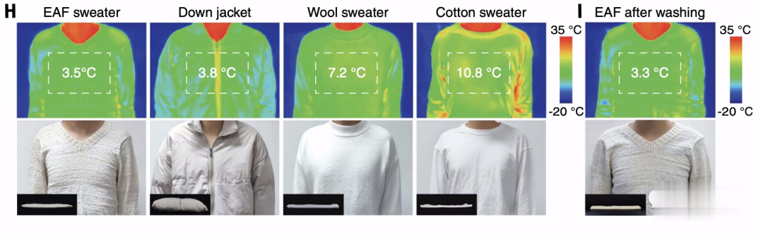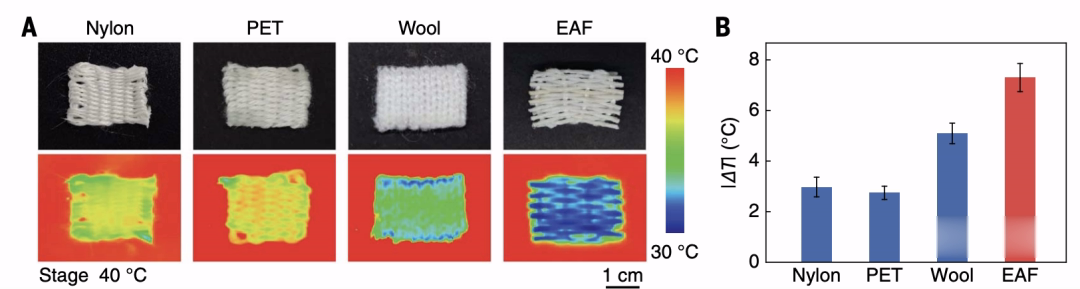 进一步计算结果表明,EAF材料的热导率仅为26.9±1.8mW/(m·K),远低于尼龙的91.2±1.6和涤纶的98.3±1.9,以及羊毛的38.9±1.1,拥有更好的保温效果。