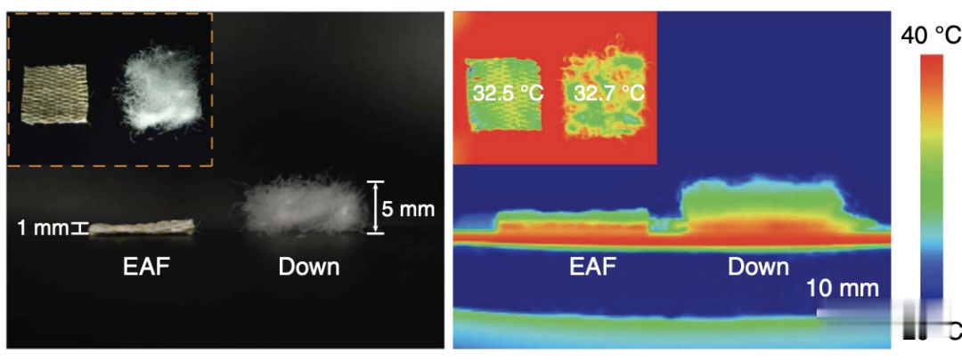 研究者接着又把EAF和羽绒进行了对比,结果是两者的保温效果接近,但EAF的厚度仅为羽绒的1/5。