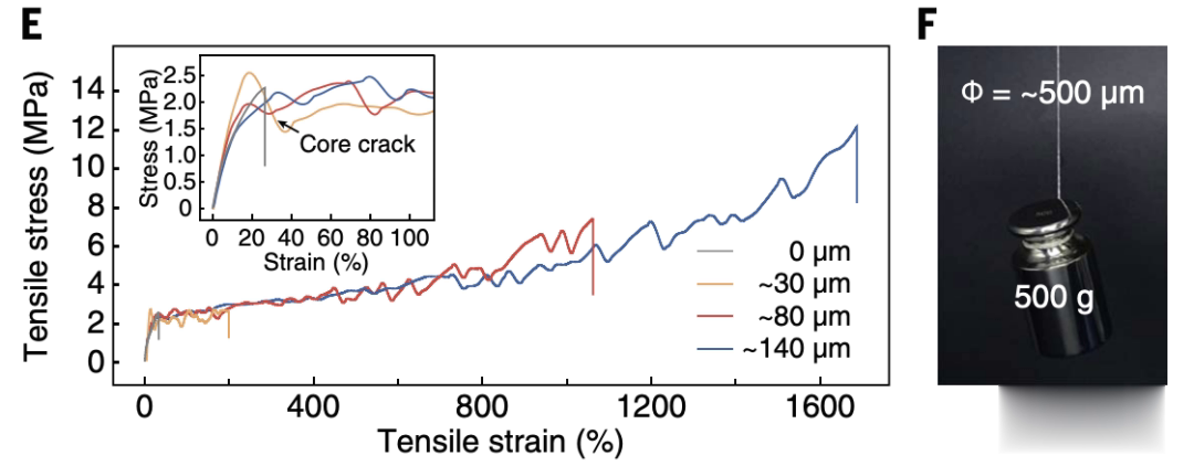 EAF的抗拉伸性能,外壳厚度为140微米的EAF材料可以承受16倍的伸长和高达12.7MPa的拉伸强度。