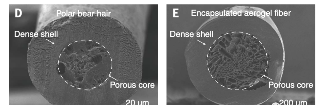 他们观察了北极熊毛发的电镜照片,发现它是一种两层结构,外层是致密的壳,内部则是疏松多孔的构造。