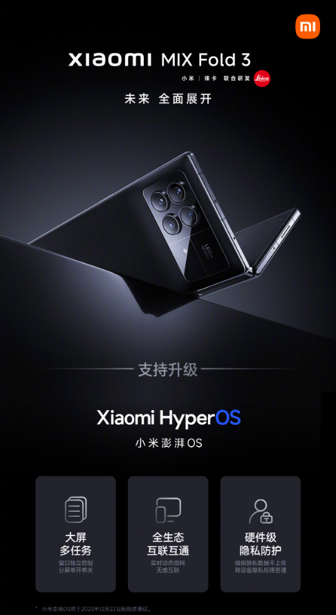 12 月 22 日,小米手机官方微博表示,小米MIX Fold 3 将支持升级 Xiaomi HyperOS 系统,带来大屏多任务的全新体验,还有全生态互联互通以及硬件级的隐私防护,还有更多创新体验等你发现。