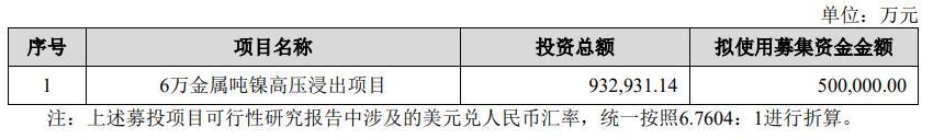 寒锐钴业2023年7月28日发布的2023年度向特定对象发行A股股票预案(修订稿)显示,本次向特定对象发行股票募集资金总额不超过500,000.00万元(含本数),并以中国证监会关于本次发行的同意注册文件为准。本次募投项目的实施主体为公司控股子公司印尼寒锐镍钴有限公司,该子公司由公司实际控制,持股比例为70%。本次发行的募集资金在扣除发行费用后,将用于6万金属吨镍高压浸出项目。