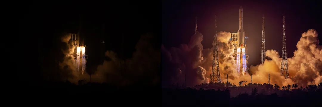 与RAW原图的对比就更加一目了然。可见,左侧RAW图中似乎是死黑的上半部,通过后期处理能完全还原出火箭箭体的层次影调;看起来已经过亮的高光,仍然能显示出充分的层次,这充分说明了EOS R5的宽容度之出色,对于表现火箭这种极端的拍摄场景,可以说是给摄影师吃了一颗定心丸。