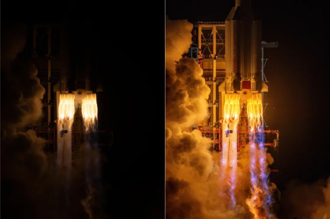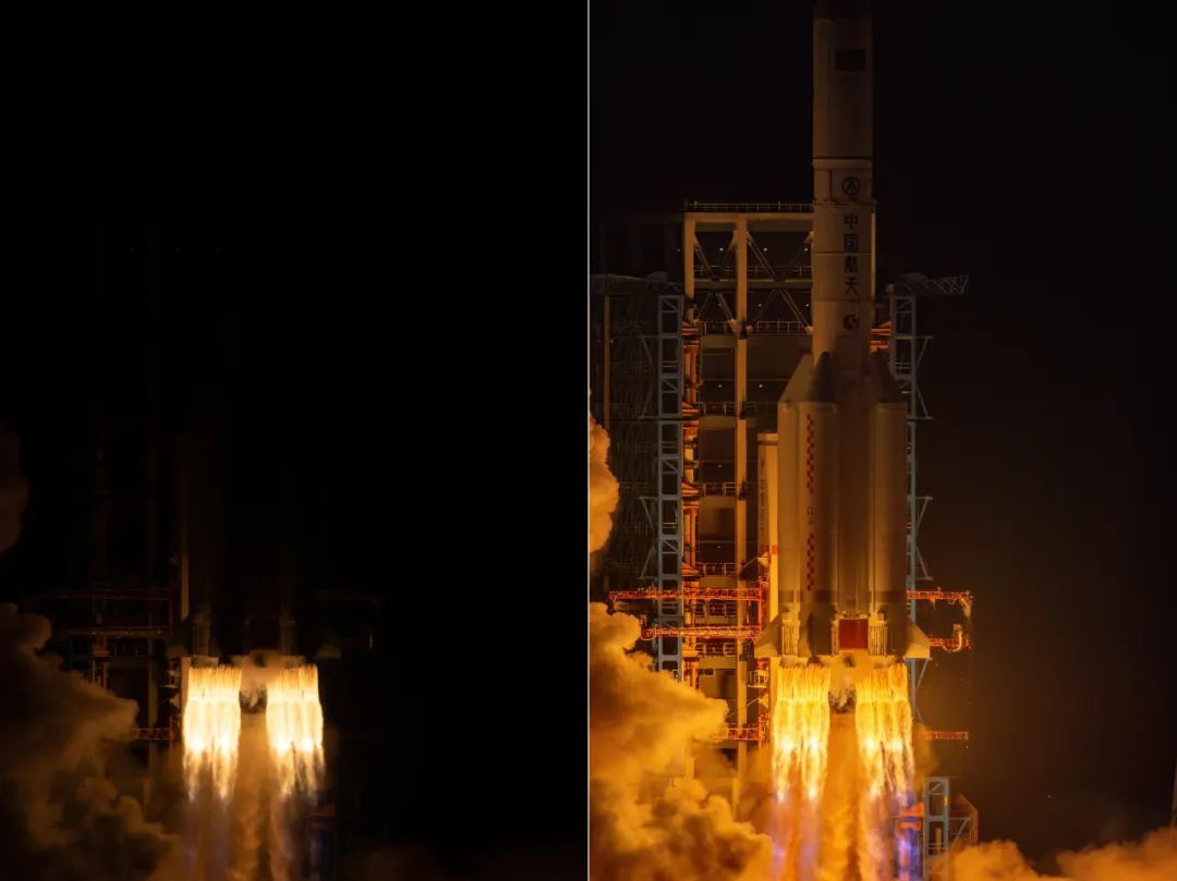 拍摄火箭发射的一大难点在于反差,由于火焰亮度具有较大的不确定性,很难完全依赖经验,需要摄影师对高光有良好的控制。本次发射在夜间进行,比起白天发射更加壮观,但同时也进一步扩大了火箭和环境的光比,大大提高了拍摄难度。