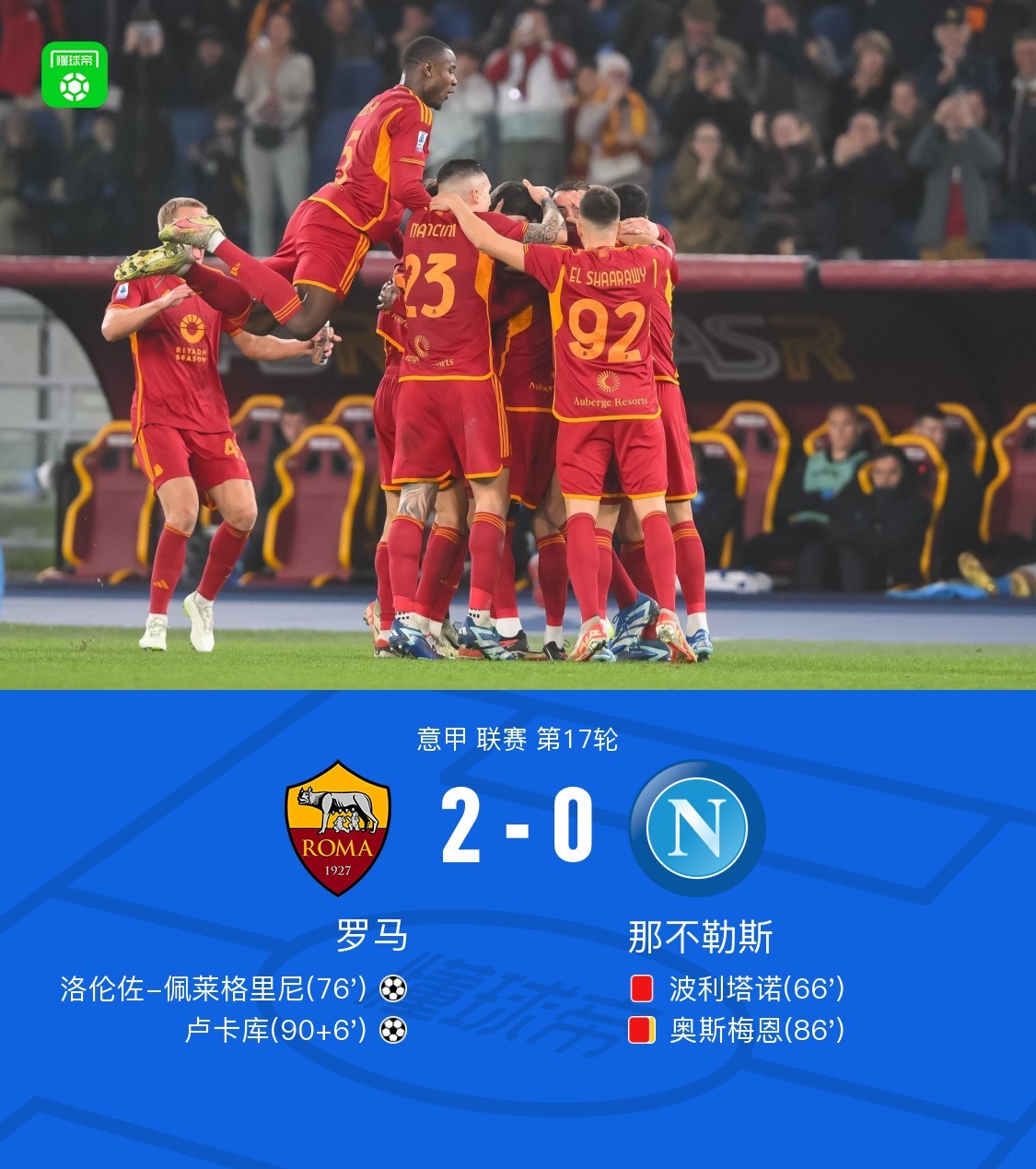 北京时间12月24日意甲 联赛 第17轮,罗马主场对阵那不勒斯。上半场博韦远射击中横梁,随后贝洛蒂传中,博韦禁区打门被神扑,下半场波利塔诺踢人染红,佩莱格里尼禁区转身抽射破门,奥斯梅恩两黄变一红被罚下场,卢卡库终场前抽射破门。最终罗马2-0战胜那不勒斯。