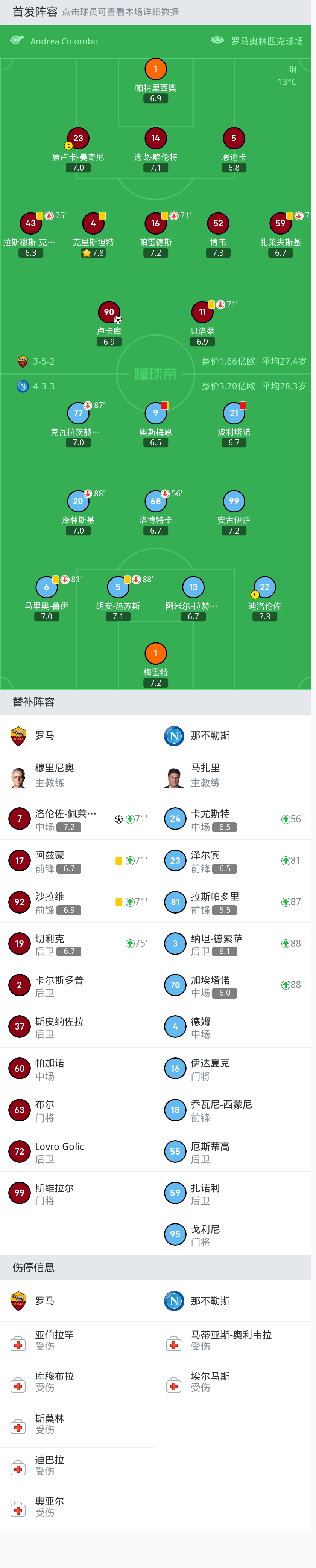 罗马首发:1-帕特里西奥, 90-卢卡库, 16-帕雷德斯, 4-克里斯坦特, 11-贝洛蒂, 14-迭戈-略伦特, 23-詹卢卡-曼奇尼, 43-拉斯穆斯-克里斯滕森, 5-恩迪卡, 59-扎莱夫斯基, 52-博韦