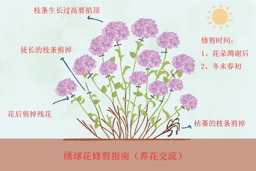 每年春暖的时候,圆锥绣球准备恢复生长,可以从根茎底部对它进行一次重剪,保留根茎底部20厘米左右的主干,可以促进重新找一些分枝,开出来的花朵会更加壮实,因为更贴近地面,也不容易出现花朵倒伏的情况。如果想要让圆锥绣球的主干长得高一些,制作棒棒糖的形态,那就春暖时就不要重剪了。