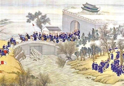 今天我们已经很难想象永定门在乾隆重建前的样子,所幸收藏于北京故宫博物院的《康熙南巡图》中有早期永定门的样貌。《康熙南巡图》展现了康熙二十八年(1689)正月初八,康熙帝第二次南巡时的盛况。画面开始即为永定门,仅有单层城楼和瓮城并无箭楼,它那卑小的形制与京城正南门极不相称。在清末民初的老照片中,永定门由二层的城楼与单层的箭楼及瓮城组成,是清乾隆十五年(1750)重建永定门时修建。