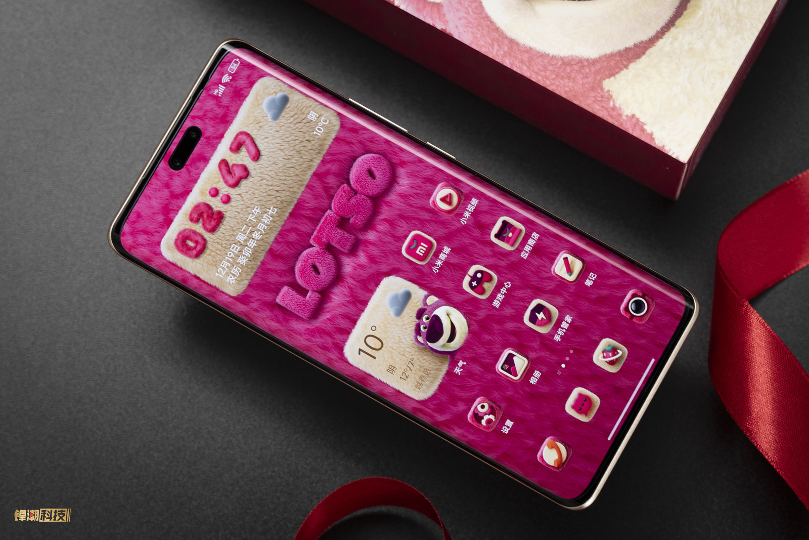手机内置一套草莓熊的定制主题,像是天气小组件,应用的图标都有进行定制,专属的锁屏时间也变成了毛茸茸的样子。