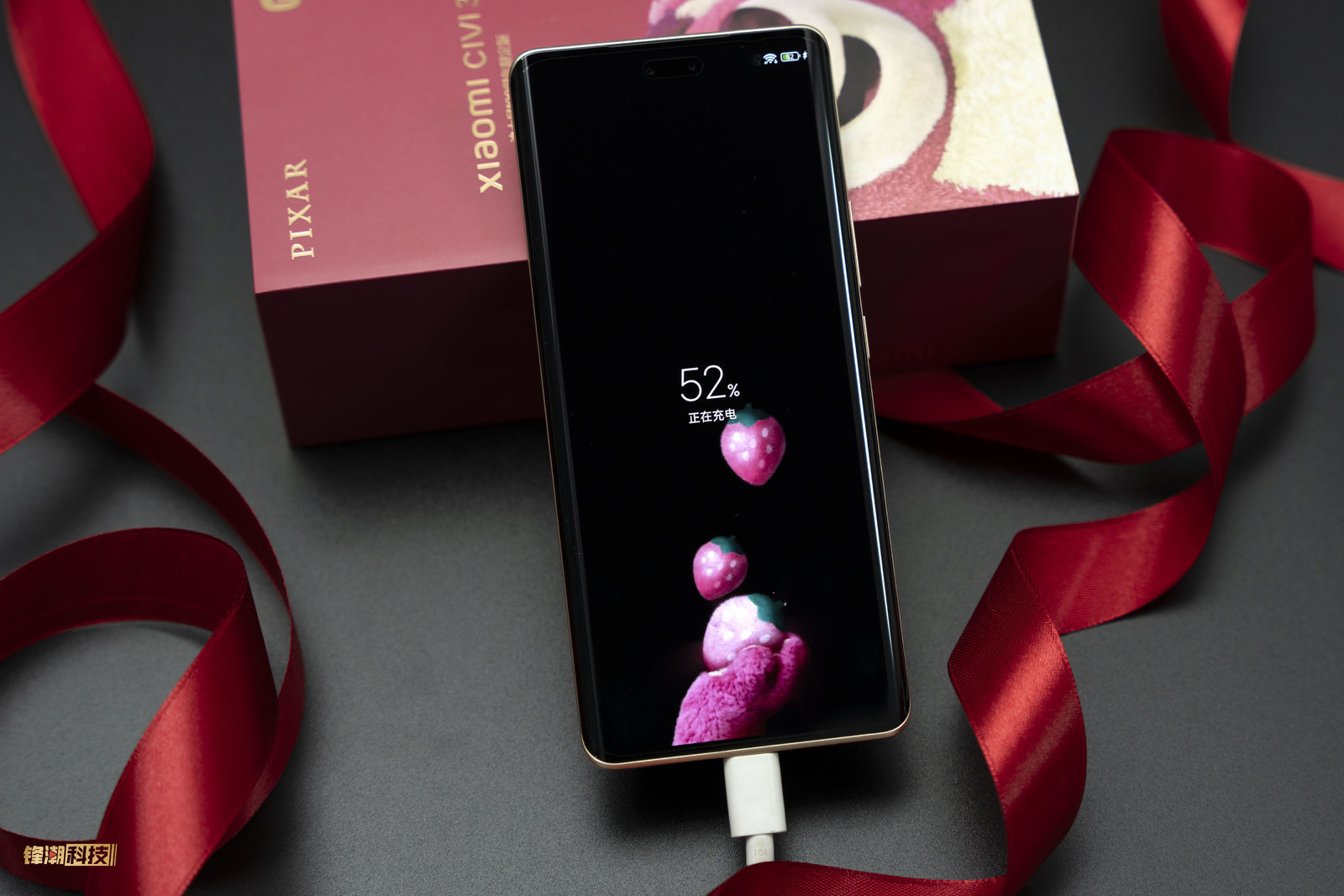 看完背盖,我们再来开个机,小米 Civi 3 草莓熊联名版定制了草莓熊的充电动画,在锁屏状态下插入电源,就可以看到草莓熊毛茸茸的大手在屏幕下方接着从空中掉下来的草莓,相当可爱。