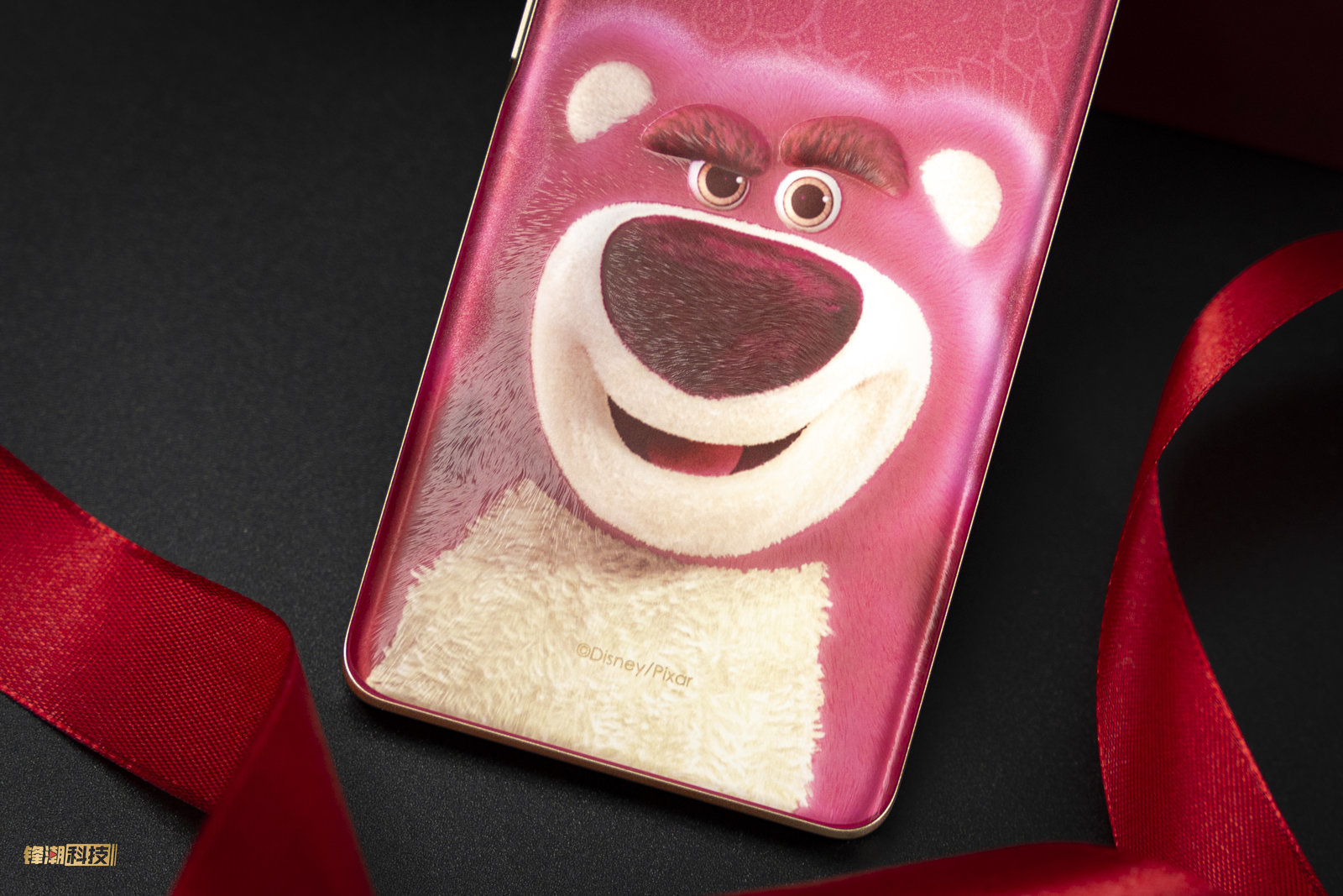 在纳米丝绒工艺之下,就是采用 3D 立体压纹工艺打造的立体五官,让草莓熊能够活灵活现地显现在背板上,也大大地提升了整机的质感。接下来一层则是高反射的光学镀膜,再下一层就是高显色的油墨层,四层紧密地结合在一起,让手机在不同的光线下也能够呈现住不同的光彩。