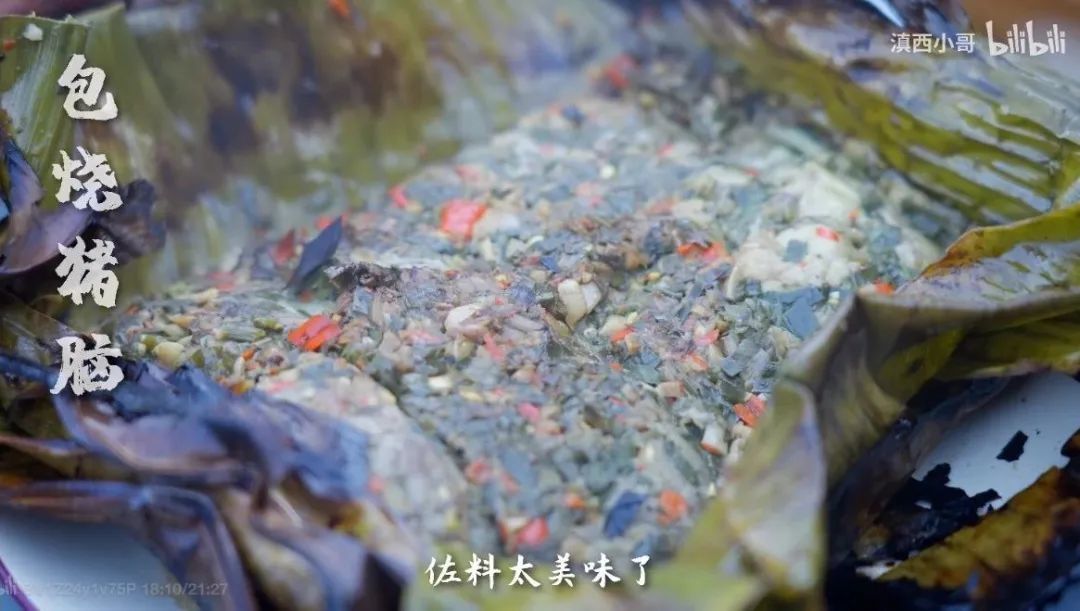 包入棕榈叶,炭烤,「包烧猪脑」是阿公的最爱。