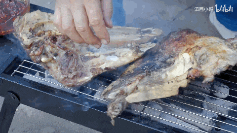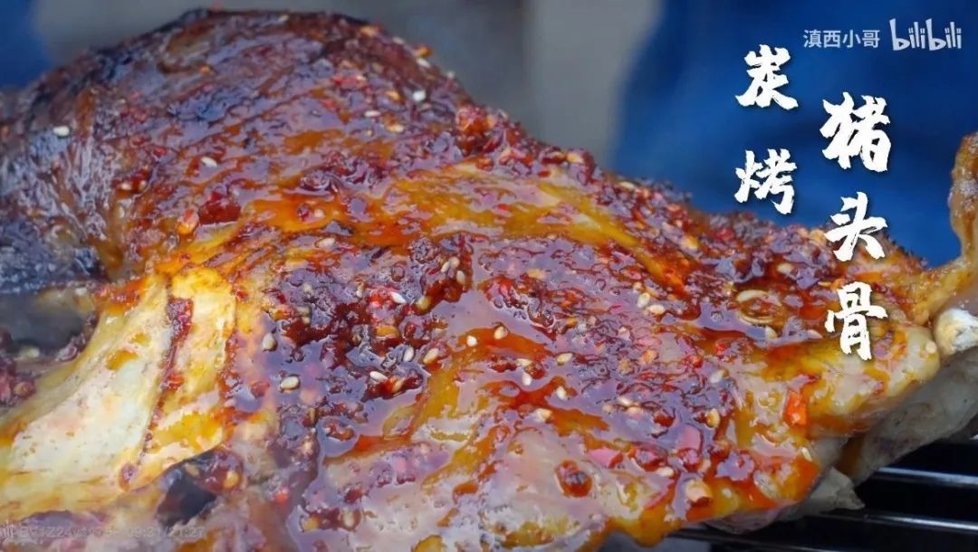 捞出上烤架,佐以调料,一道「炭烤猪头骨」上桌。