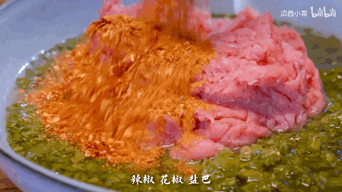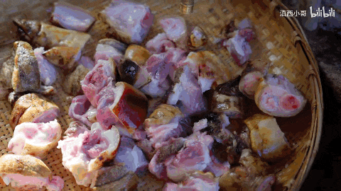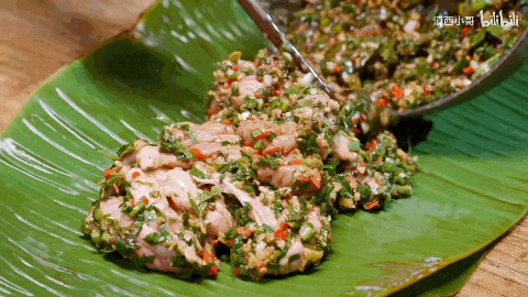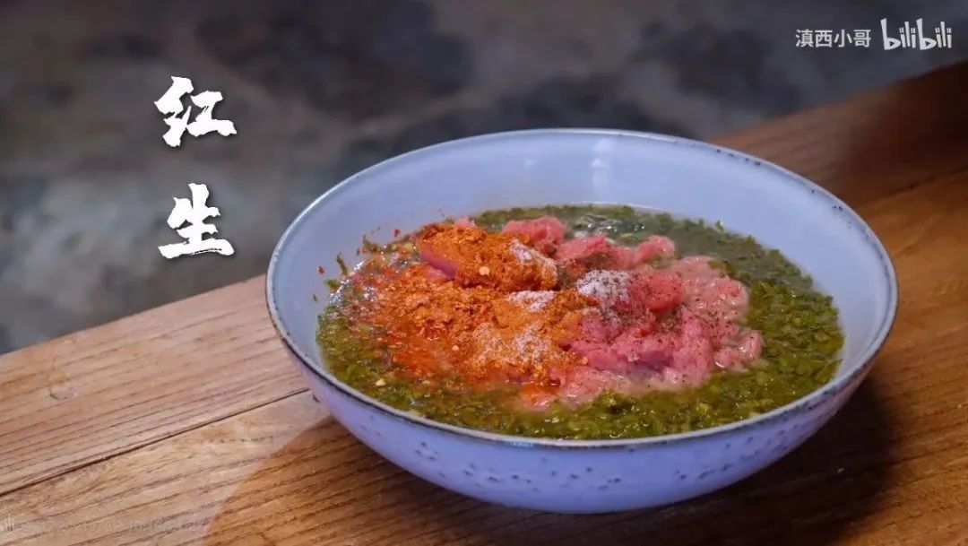 加入水腌菜,用辣椒粉,花椒,盐巴,山胡椒调味,是云南人离不开的「红生」。