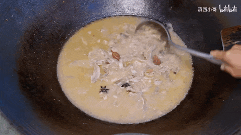 烧干净毛的猪头骨,在铁锅中炖至软烂,