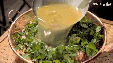 牛肚、牛场、牛肉、牛筋铺底,再盖上一大把薄荷叶,淋上几勺浓郁的肉汤,