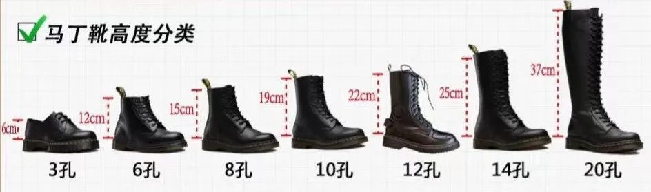 马丁靴按照高度分有相当多,3/6/8/10/12等等。