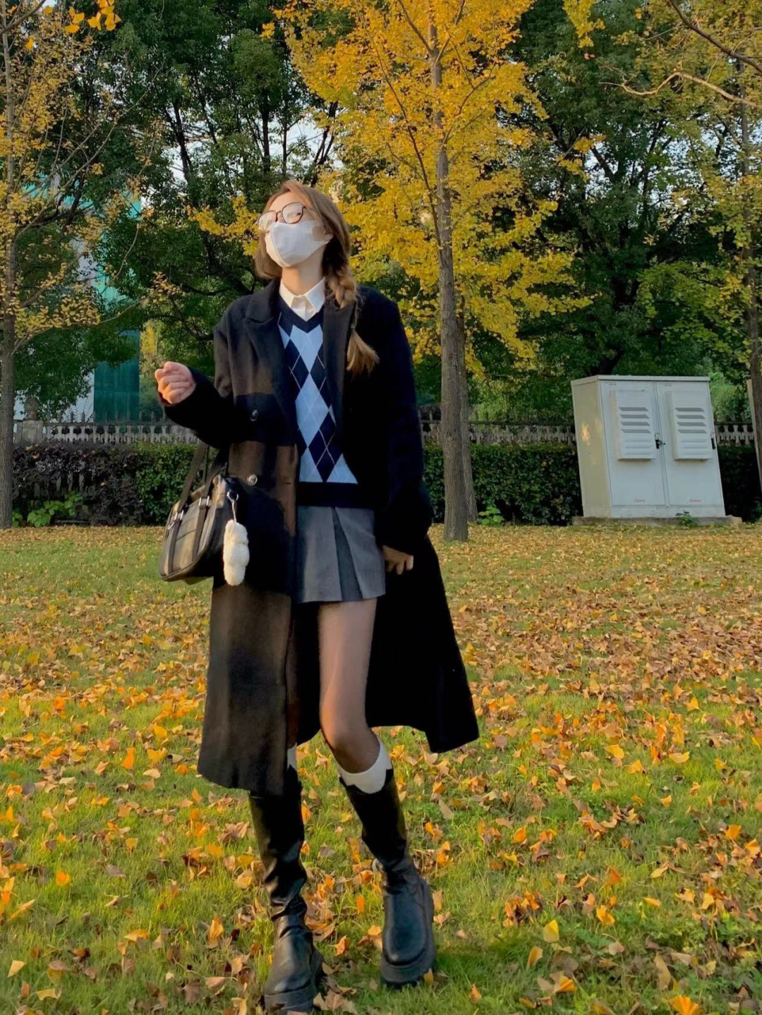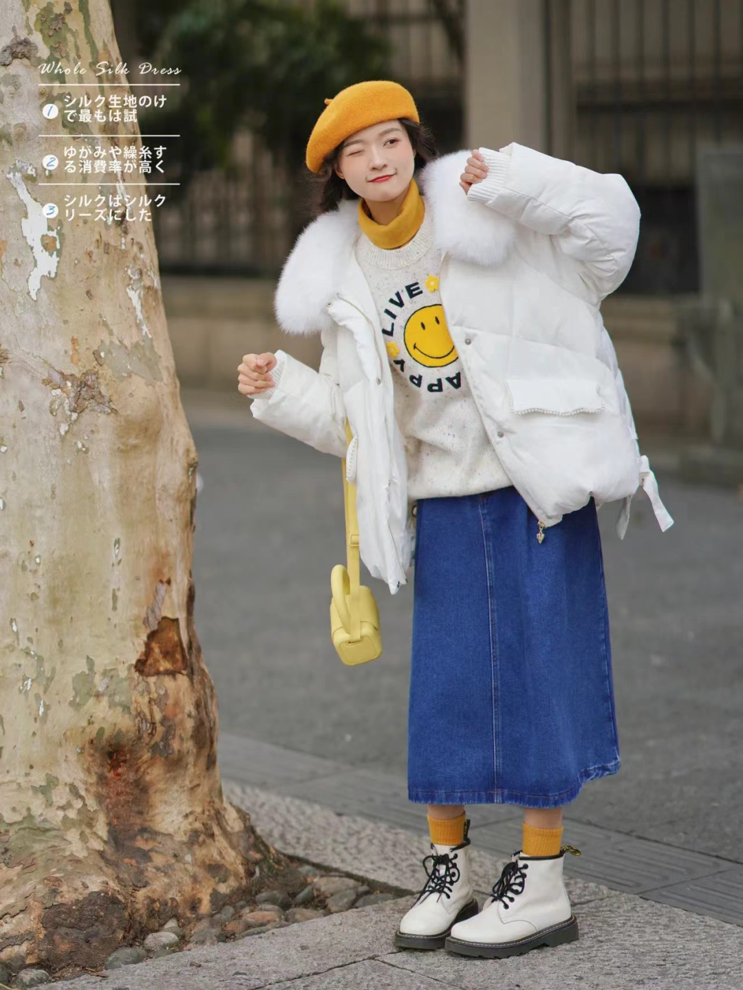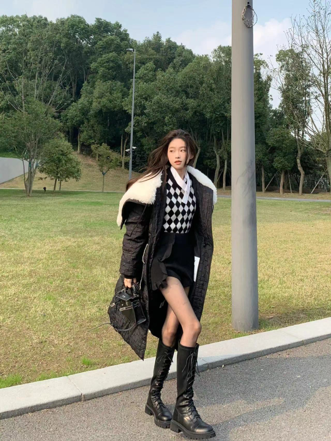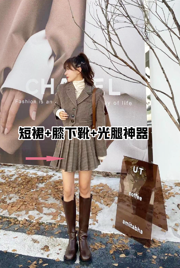 嫌短裙冷的姐妹在外面可以套上羽绒服!