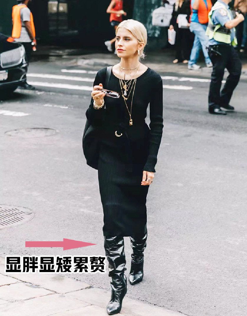 尤其是这种宽+褶皱堆积的靴子遇上长裙,显胖还显腿弯显矮,三大禁忌都犯了!