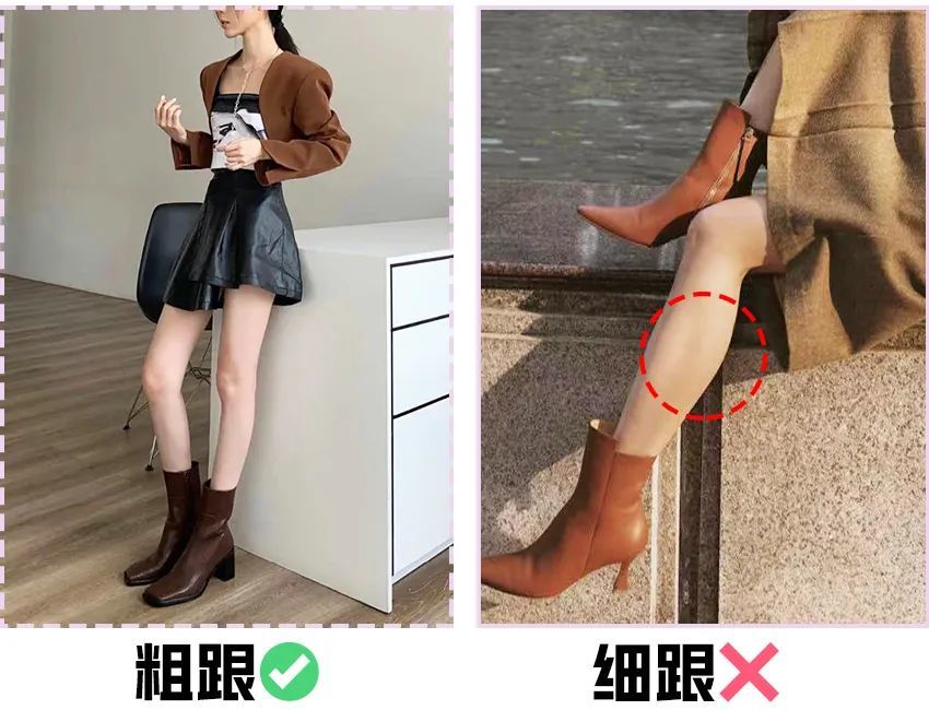 像腿粗的姐妹就非常不适合细跟的靴子,细跟和腿粗形成鲜明对比👇