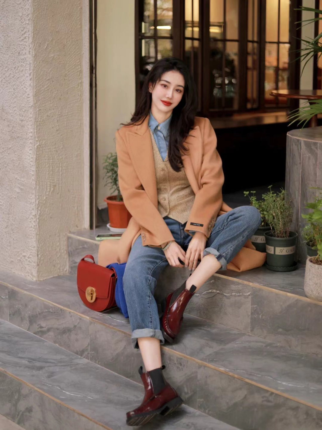 有些姐妹想走温柔路线的,可以选粗跟扁方头的切尔西靴。