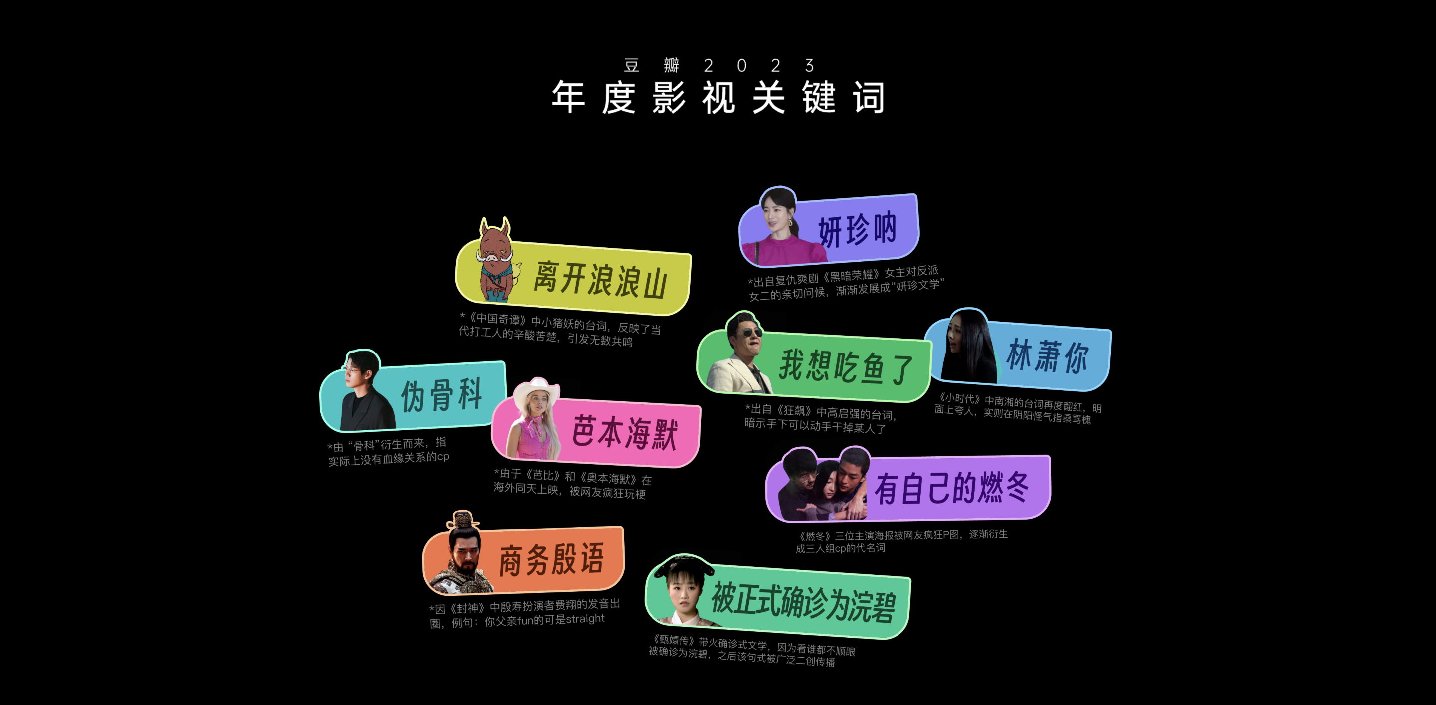 同时,榜单还发布了“年度影视关键词”,大热剧集《狂飙》中高启强每次暗示手下可以干掉某人时的台词“我想吃鱼了”,因《封神》中殷寿扮演者费翔的发音出圈的“商务殷语”、包揽了“2023评分最高韩剧”前两名的《黑暗荣耀》里的台词“妍珍呐”,还有被《甄嬛传》带火的确诊式文学“被正式确诊为浣碧”,都纷纷上榜。