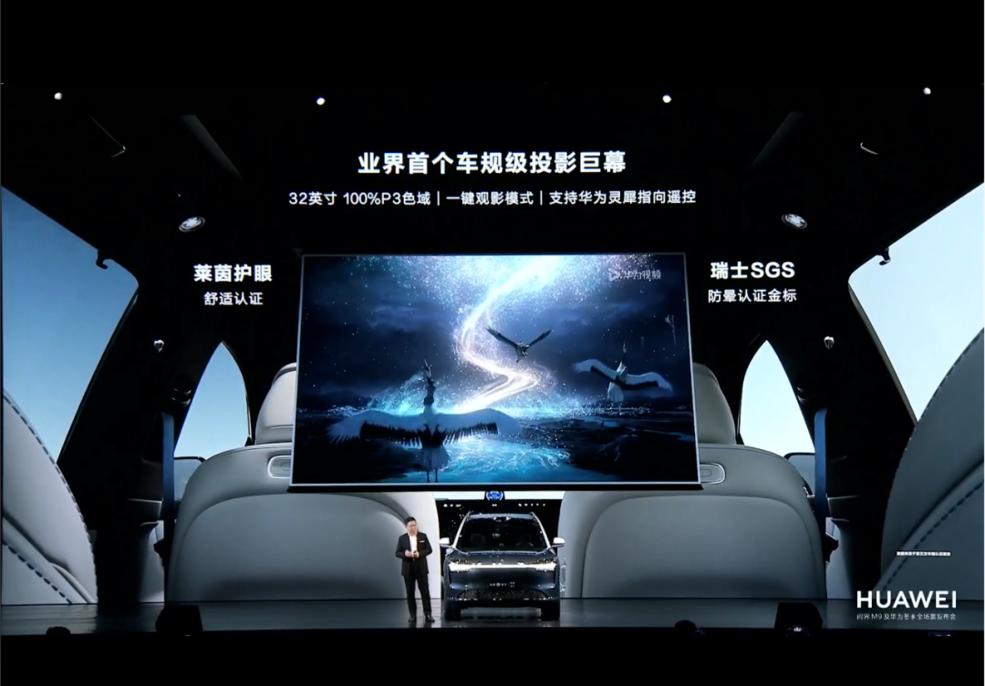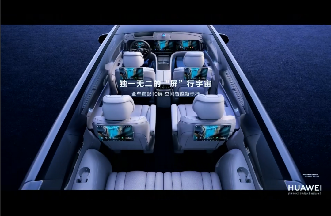 全车拥有 10 个屏幕,并且拥有行业首个车内投影巨幕,配备 25 单元录音棚级别的音响,星环散射体集成光影美学氛围灯,与华为领先的技术与算法搭配,让视听享受更加舒服。