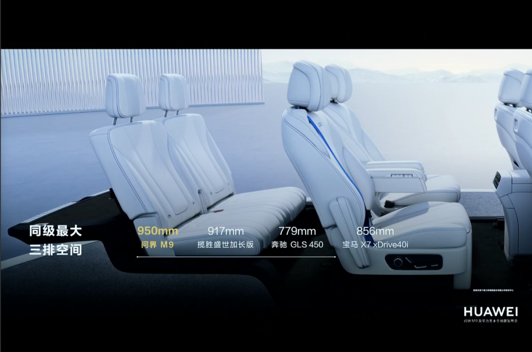 问界 M9 在座椅上也做足了功夫,座椅上,加热、通风、按摩、14 向电调等功能统统有,副驾女王座驾、二排零重力座椅,三排空间宣称都超过了一米,全部配备独立的充电口、杯托、手机槽,实现六座均权。