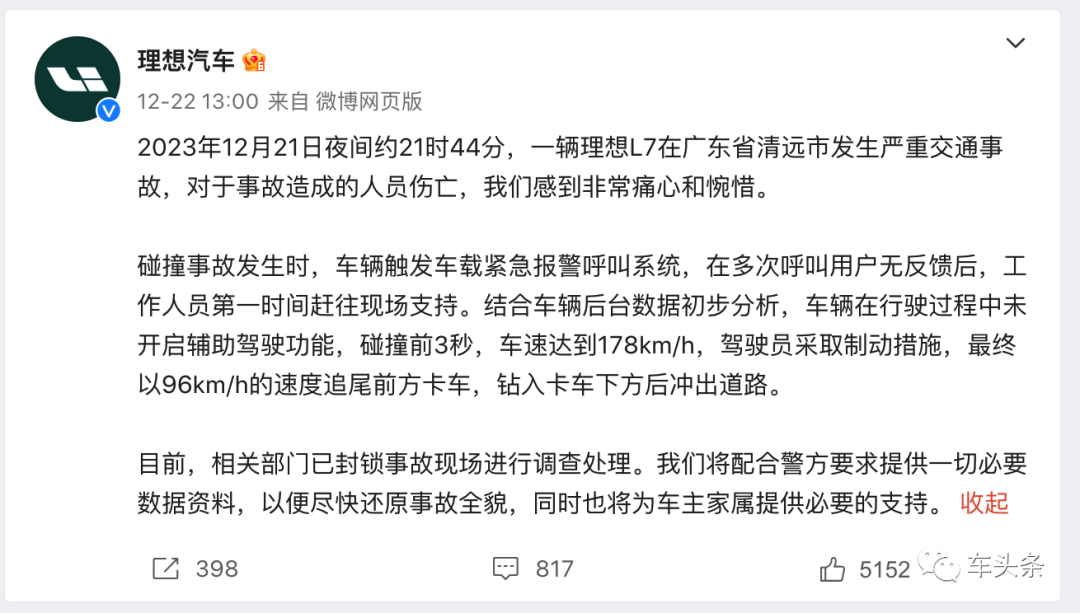 2023年12月21日21时许,一辆理想L7在广东省清远市发生严重交通事故,驾驶员和一名乘客死亡,另一名乘客受伤。