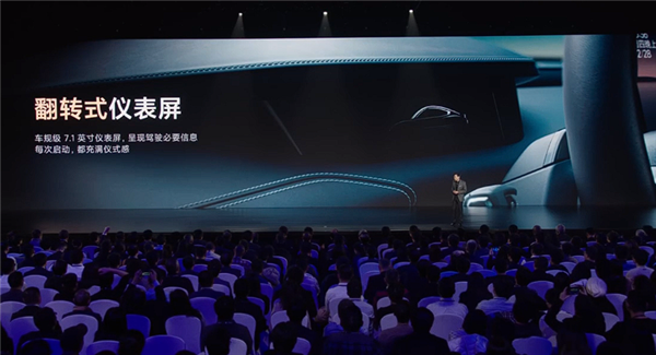 据雷军介绍,小米SU7拥有更先进的交互架构,配备有16.1英寸中控生态屏,分辨率高达3K,同时还配备了56英寸的AR-HUD抬头显示,更为酷炫的是,这款车还配配有翻转式仪表屏,每次开车时,都富有满满仪式感。