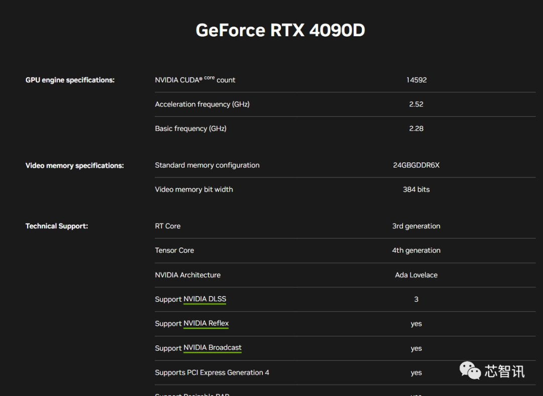 根据公布的资料显示,RTX 4090 D搭载了AD102-250 GPU,CUDA核心数量从RTX 4090的16,384个减少至14,592个((128 个 SM 减少到 114 个 SM),降低幅度达到了12.8%。同时,Tensor核心数量从512个减少至456个,RT核心数量从128个减少至114个。也就是说总体的核心数量大概减少了约11%。不过,由于RTX 4090 D的基础频率比RTX 4090的2235 MHz要高一些(提升约2.2%),由2230MHz小幅提升到了2280 MHz,弥补了一点性能损失,而加速频率则与RTX 4090相同,维持在2520 MHz。另外,RTX 4090 D仍然会配备24GB的GDDR6X內存,传输速率为21 Gbps。
