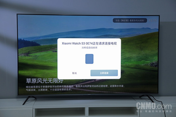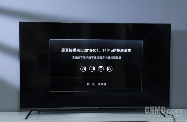 小米手机则可以通过NFC一碰传投屏电视,首次连接,触碰NFC区域后,电视会有投屏请求弹窗,需要按照特定顺序按下遥控方向接受投屏,并不能直接点击确定,很有意思,完成认证后就成功投屏了。