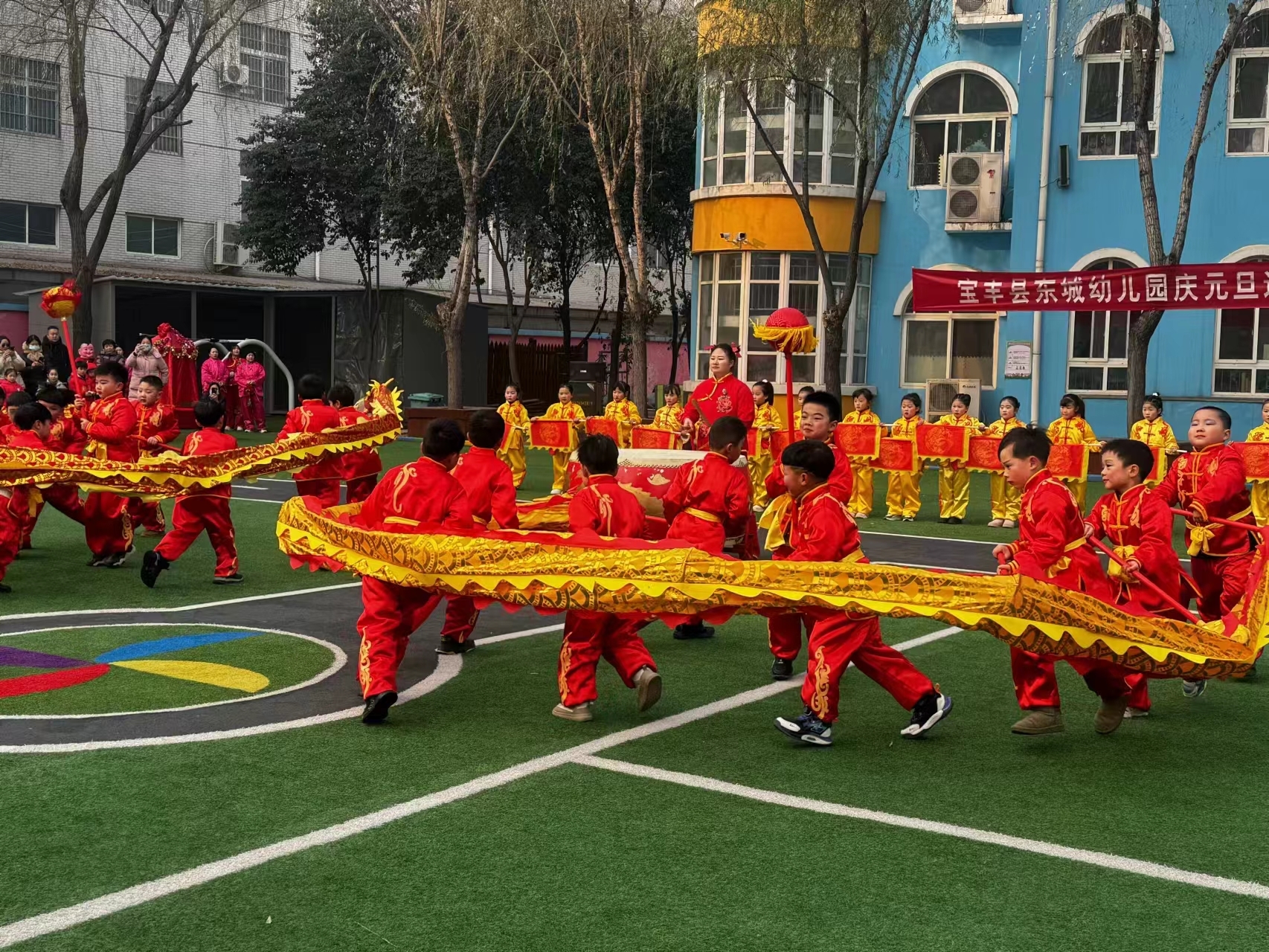 伴随着阵阵鼓声,只见一群可爱的小朋友握着竹柄,在龙珠的引导下,穿,腾,跃,翻,滚,戏,缠,整套造型喜庆又可爱,呈现出金龙腾飞喜气洋洋景象。
