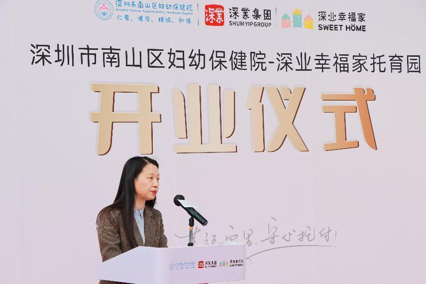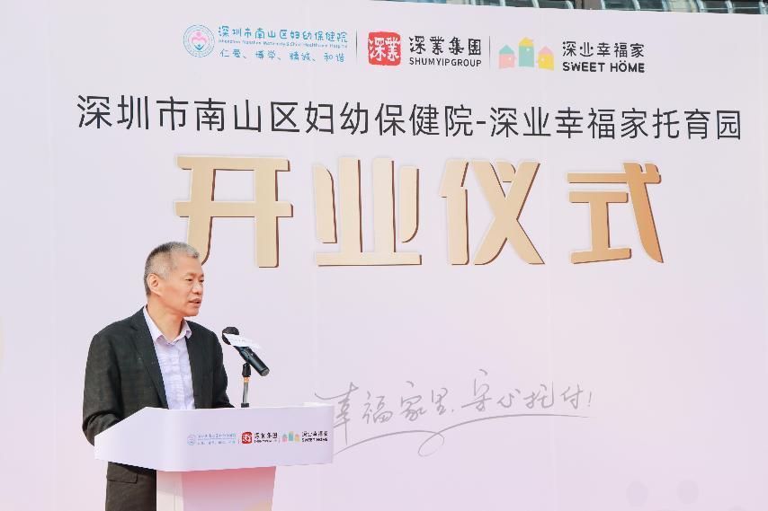 深圳市南山区卫生健康局副局长朱薇表示,该托育园顺利开业离不开各方整合资源、凝聚力量,推动建立0-3岁婴幼儿“医育结合”托育服务体系的重要举措,是南山区探索构建生育支持政策体系,提升婴幼儿照护服务水平的生动实践。希望南山区妇幼保健院-深业幸福家普惠性托育园不断探索发展“医育结合”新模式,提高辖区婴幼儿照护服务水平,满足婴幼儿家庭科学养育需求。希望深圳幸福健康集团加强与南山区相关部门、街道的沟通合作,充分发挥国企示范引领作用,促进政府、社会机构和民间力量的联动合作,实现普惠性托育资源的共享与优化配置,让辖区居民的获得感成色更足、幸福感更可持续、安全感更有保障。